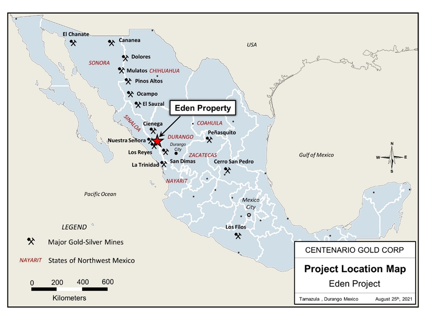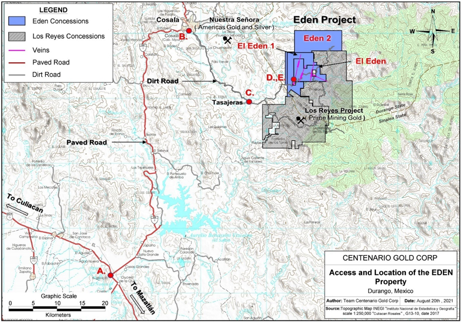 The Eden Property is located in SE Sinaloa State, Mexico in the southwestern foothills of the Sierra Madre Occidental, 37 km E-SE of Cosala, an old mining town located 160 km north of Mazatlan and 160 km southeast of Culiacan, the capital of Sinaloa.