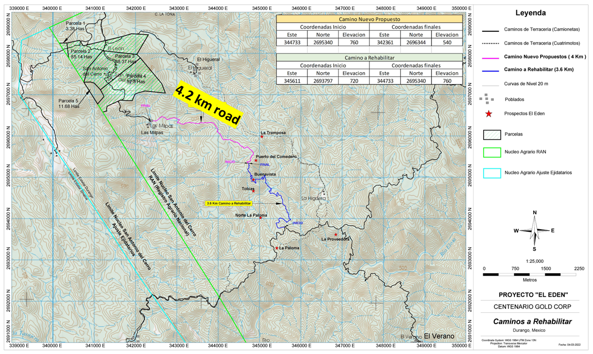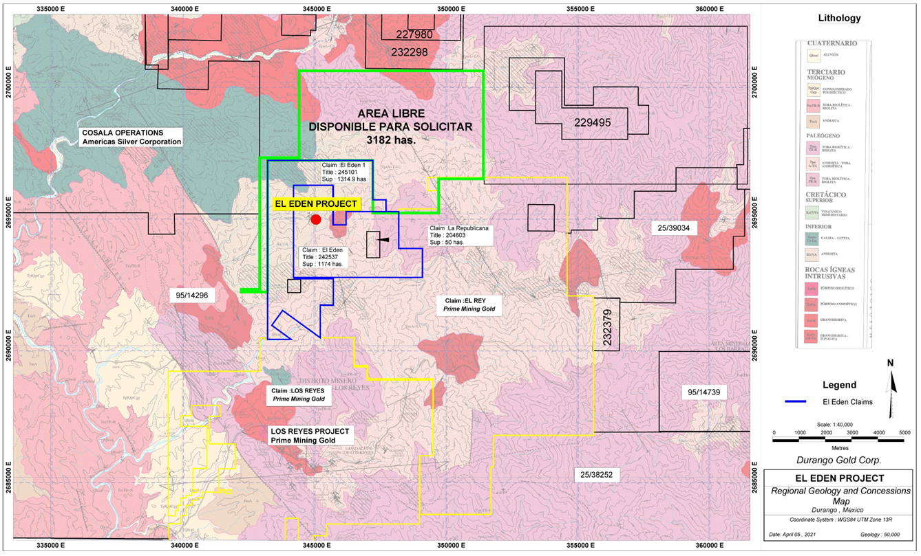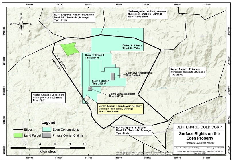 Most of the Eden Property belongs to the ‘Ejido’ of Tamazula, state of Durango, where the surface rights are held by a local agrarian association, or ‘Nucleo Agrario’, named ‘San Antonio del Cerro’, which forms part of the larger Tamazula Ejido.